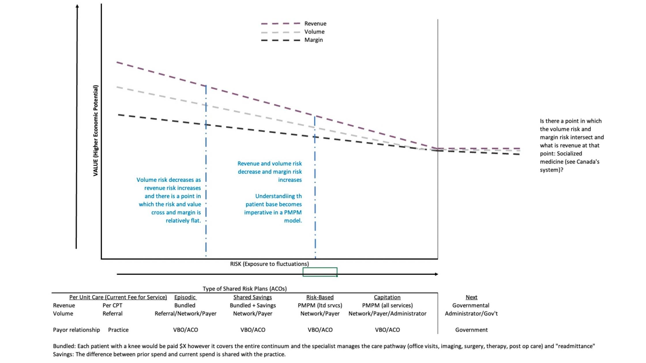 Over the last decade, the system has increasingly shifted toward models that focus on the continuum of care rather than each individual episode. One major step in that direction is episodic care / bundled payments, where a provider agrees to a predetermined payment for an entire course of care—imaging, surgery, office visits, therapy, and follow-up. Patients may still be referred to other providers, but insurers steer them toward in-network participants in the episodic model. The payment is bundled, and it becomes the provider’s responsibility to manage the care pathway effectively. This often creates lower revenue per episode and more margin pressure. The provider trades the margin risk for more patient volume.